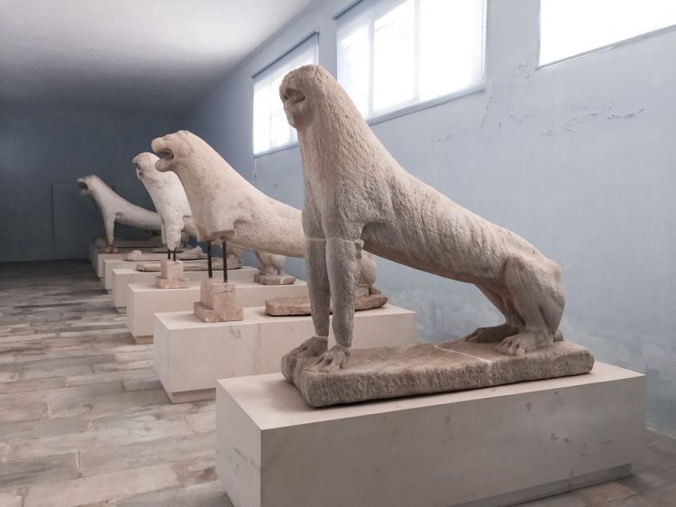 Los leones de mármol originales se conocen como la terraza de los leones que solían estar afuera pero fueron llevados adentro para protegerlos de una mayor erosión.La terraza fue erigida y dedicada a Apolo por la gente de Naxos justo antes del 600 a. C. y consistía en una fila de nueve a doce leones tallados en mármol que miraban hacia el este, hacia el Lago Sagrado de Delos. Los leones, con la boca abierta, como si rugieran o gruñieran, estaban destinados a proteger los santuarios e inspirar un sentimiento de temor divino entre los adoradores.