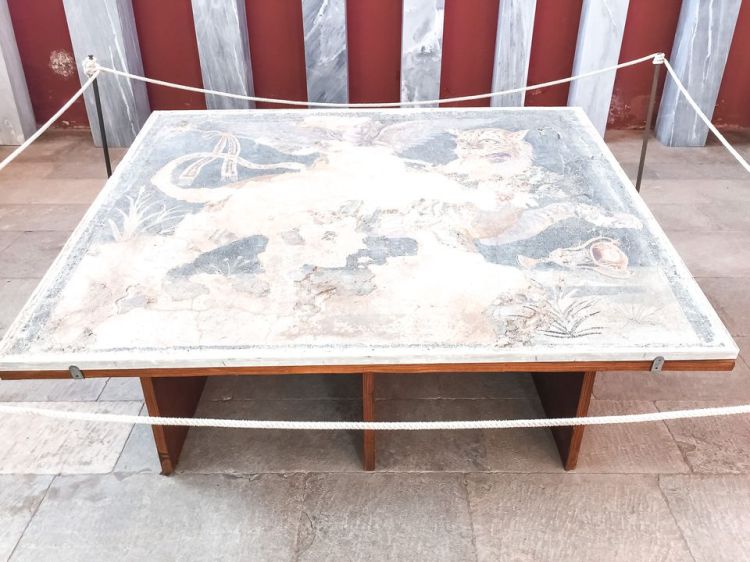 Es una locura pensar que casi la mitad de todos los mosaicos griegos existentes del período helenístico provienen de Delos. Este representa al dios Dioniso como un demonio con alas montado sobre un tigre y es de finales del siglo II a.C.