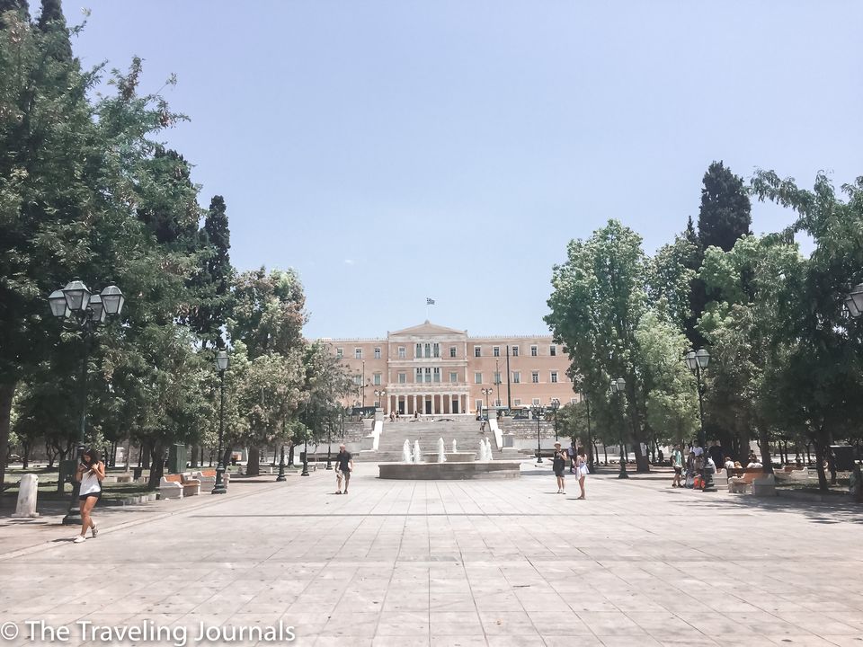 Strolling around Syntagma Square, which is the central square of Athens, and at the far end, you can see the 19th Century Old Royal Palace, where the Greek parliament is located.