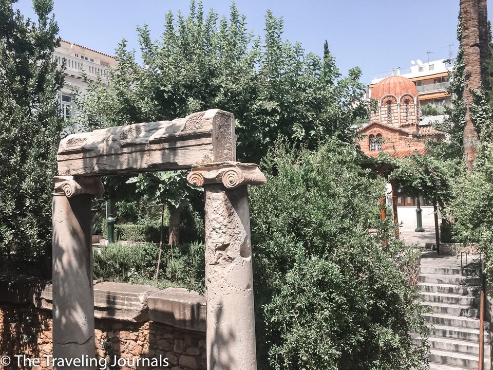 Aquí puedes ver a la derecha de la imagen un poco de la Iglesia de Panagia Kapnikarea, es una iglesia ortodoxa griega y una de las iglesias más antiguas de Atenas.
