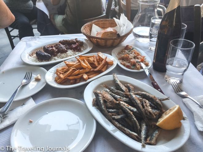 My last lunch in Greece. On the left is soutzoukákia, a bed of rice and the meat which tends to be lamb cooked with onions, tomatoes, and cumin for seasoning, fresh french fries, to the right is melitzanosalatá which is a salad made of eggplants and the fried gávros (the little fishes)