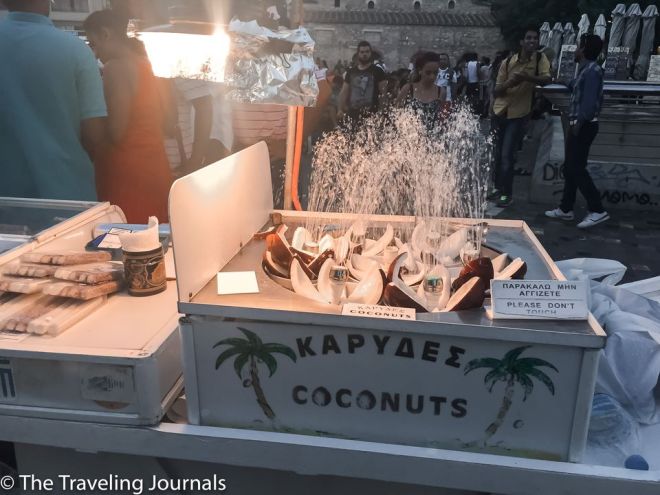 A street food vendor in Plaka selling coconuts and other sweets. Interesting display that I’ve never seen before. In my country (DR), you can buy coconuts too, they keep them in a fridge so that the water is cold, they only open them when you buy them, you get to drink cool fresh coconut water and eat the meat.