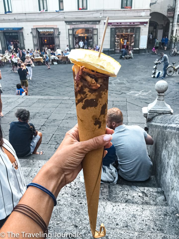 Mientras me preparaba para irme de Amalfi, seguía encontrándome con gente que comía mariscos y me hacía babear … Terminé preguntando a alguien dónde podía conseguirlo y me enseñó el camino. Era un lugar para llevar y, ¡oh, la variedad de mariscos fritos era genial! Tengo debilidad por lla comida frita… elegí calamares y camarones, los envuelven en el papel como un cono con un trozo de limón … me senté a disfrutarlo y claro, también me preguntaron: ¿dónde puedo comprar eso? jajaja…