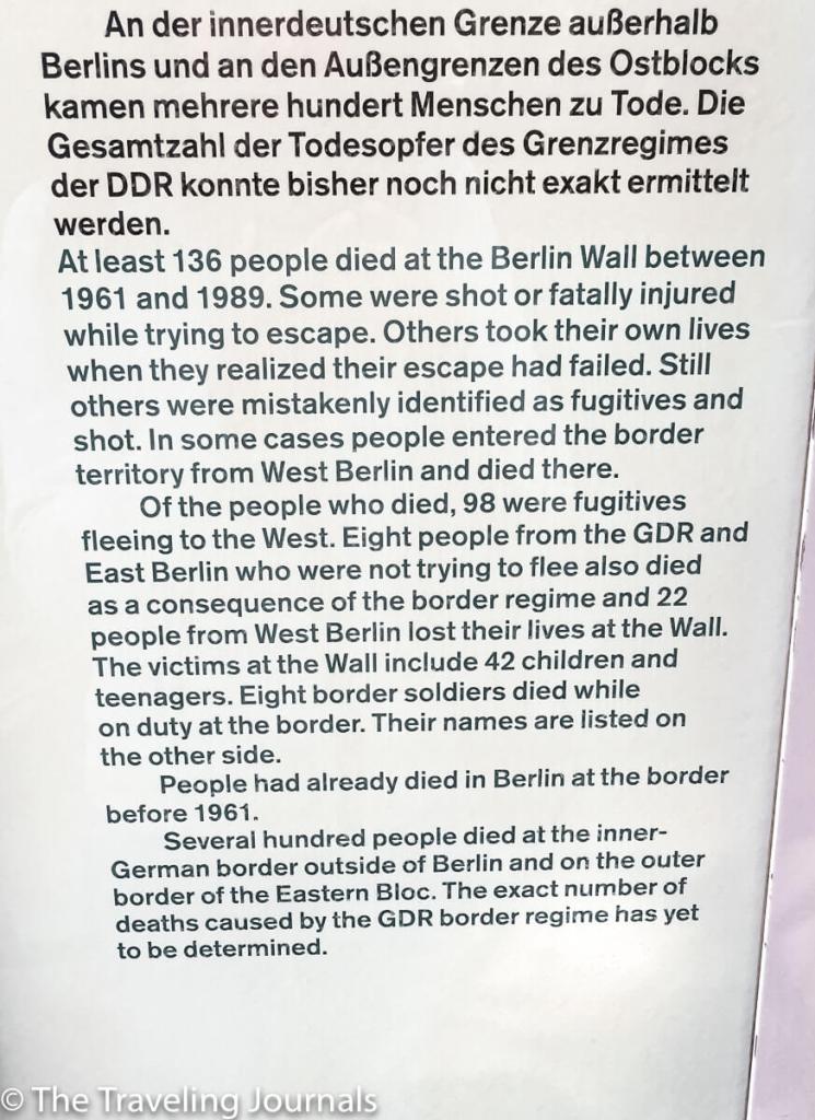 I walked around the entire open-air exhibition, where you will find metal markers in areas where the wall used to stand and a memorial to honor the 136 souls that lost their lives trying to cross the border.